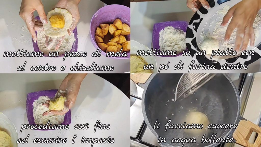 • Colocamos um pedaço de maçã no centro e fechamos formando uma bolinha. Colocamos as bolinhas em um prato com um pouco de farinha no fundo. Procedemos assim até acabar a massa. Cozinhamos em água fervente por alguns minutos