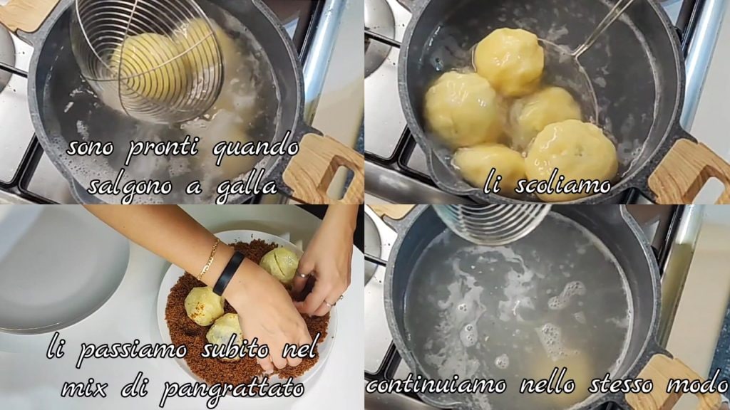 • (quando estiverem prontos, eles sobem à superfície). Escorremos e passamos imediatamente na mistura de farinha de rosca.