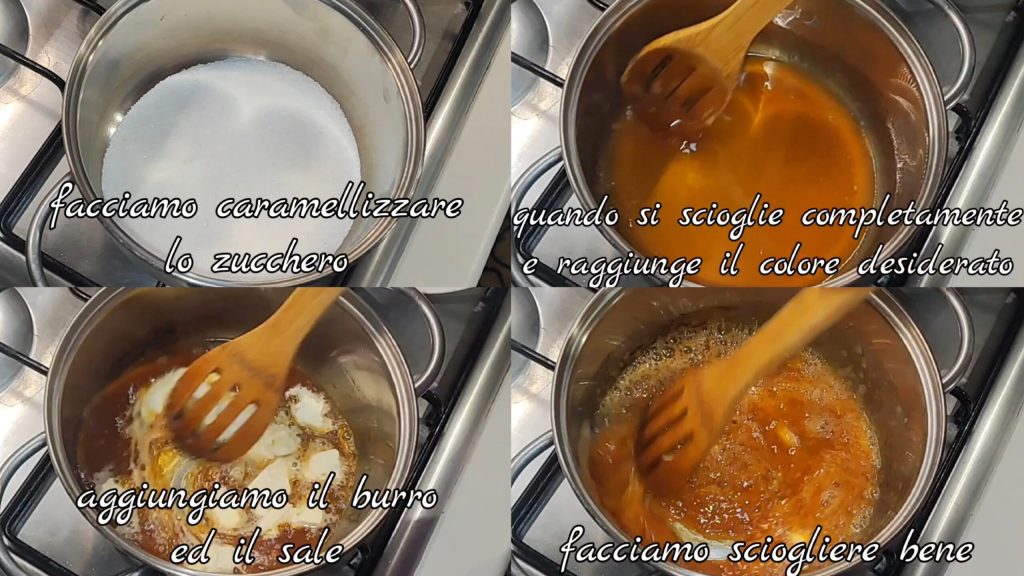 Coloque o açúcar em uma panela e deixe caramelizar. Quando derreter completamente e atingir a cor desejada, adicione a manteiga e o sal, e deixe derreter completamente.