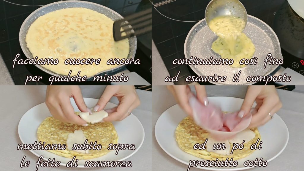 Cozinhe por mais alguns minutos. Continue assim até terminar toda a mistura. Assim que estiverem prontas, coloque imediatamente um pouco de scamorza e um pouco de presunto em cada uma.