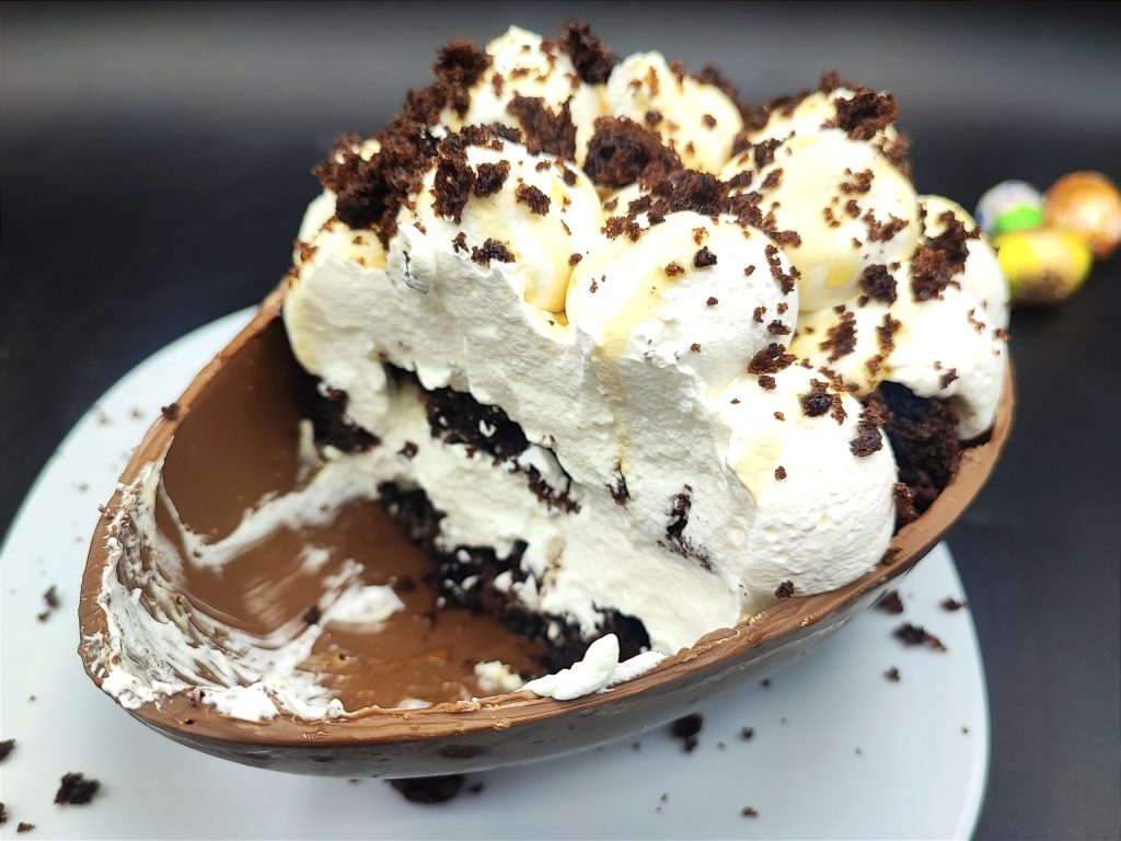 Ovo de chocolate recheado com creme de leite e pão de ló