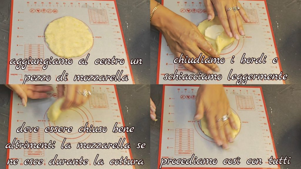 Colocamos um pedaço de muçarela no centro, fechamos as bordas e amassamos levemente. Devem estar bem fechados para evitar que a muçarela saia durante o cozimento. Procedemos assim com todos.