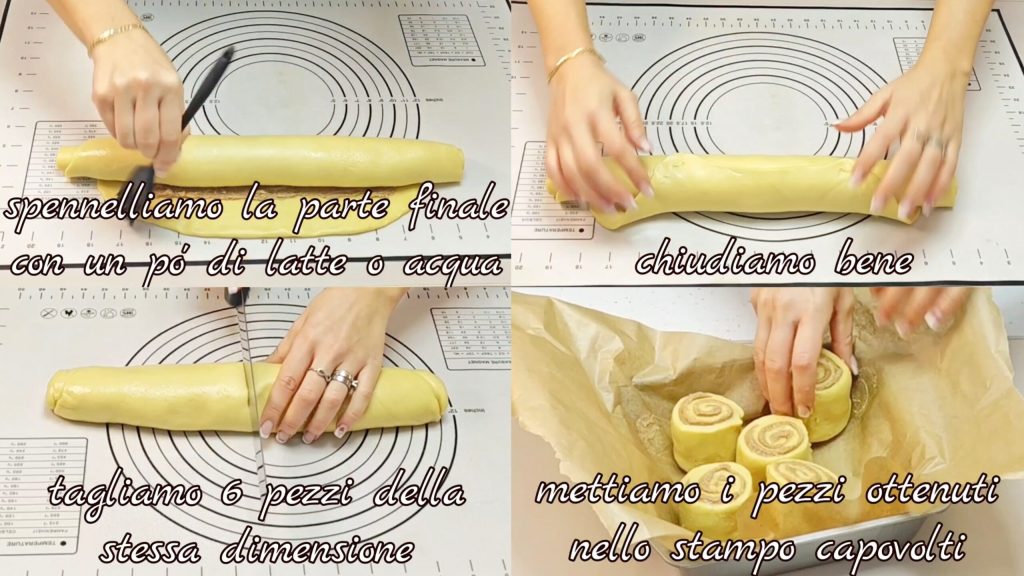 pincelamos com um pouco de leite a parte de fechamento. Cortamos o rolo obtido em 6 partes iguais. Colocamos em uma forma de cabeça para baixo,