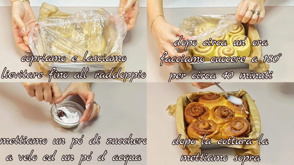 cobrimos e deixamos crescer até dobrar, depois assamos a 180° por cerca de 40 min. Misturamos um pouco de açúcar de confeiteiro e água e depois do cozimento acrescentamos por cima.