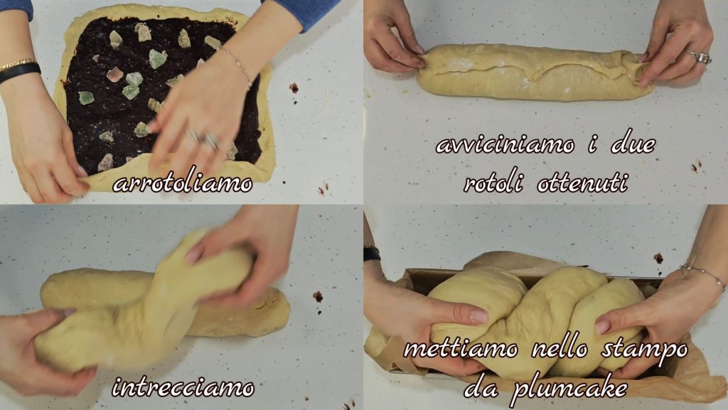 Juntamos os dois rolos obtidos e os trançamos. Colocamos na forma de bolo inglês,