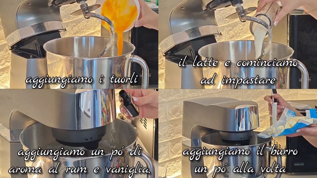 Despeje o leite e comece a amassar, adicionando um pouco de aroma de rum e baunilha.