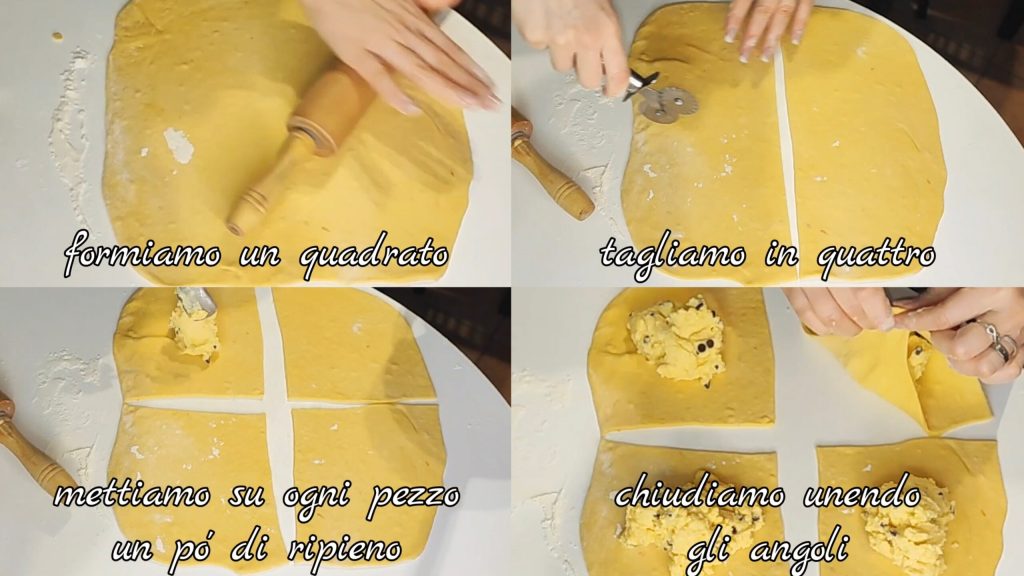 Formamos um quadrado e cortamos em 4 partes iguais. Colocamos um pouco de recheio em cada pedaço e fechamos unindo os cantos.