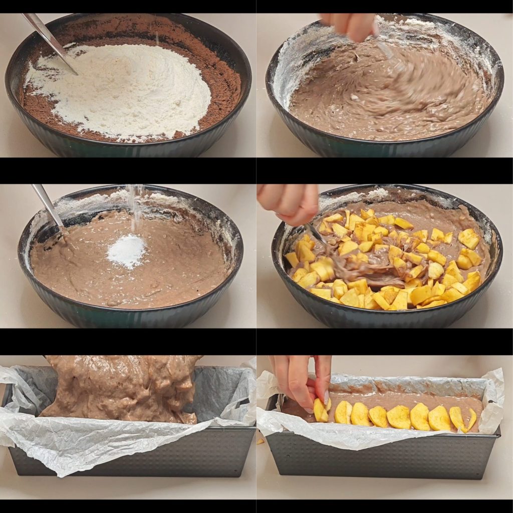 Primeiro, limpamos e cortamos as maçãs e as deixamos de lado. Amassamos as bananas com um garfo. Adicionamos o óleo, as raspas de limão, a água com gás, o cacau, o açúcar, um pouco de canela