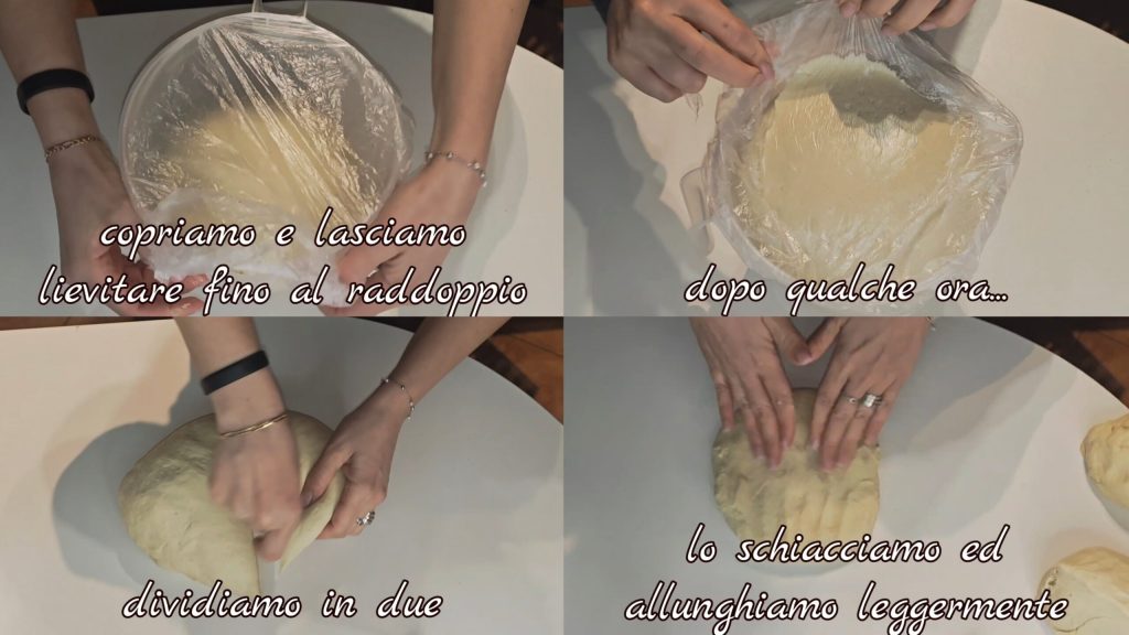 cobrimos e deixamos fermentar até dobrar de volume. Após algumas horas, pegamos, dividimos em duas partes iguais. Pegamos a primeira parte da massa e pressionamos, alongando-a levemente