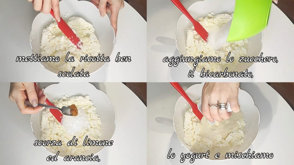 Colocamos a ricota bem escorrida, o açúcar, o bicarbonato, raspas de limão e laranja, o iogurte e misturamos.