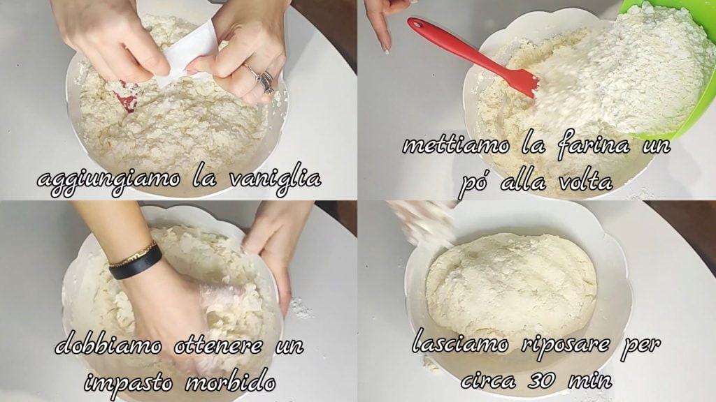 Adicionamos a baunilha e a farinha aos poucos, amassando. Devemos obter uma massa macia. Deixamos descansar por cerca de 30 minutos.