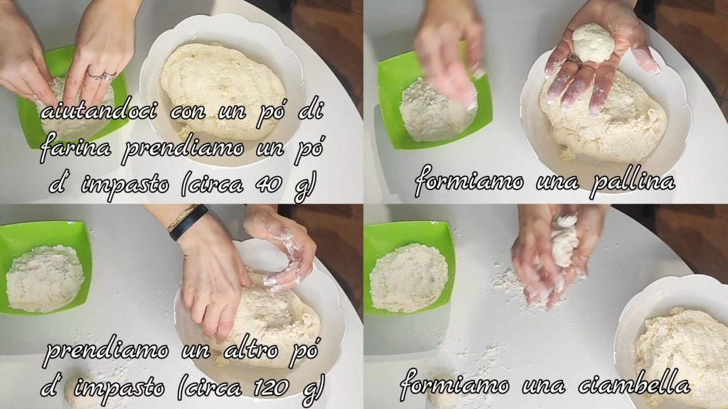 Após cerca de 30 min, com a ajuda de um pouco de farinha, pegamos um pouco de massa, cerca de 40 g, e formamos uma bolinha. Pegamos outra parte da massa (aproximadamente 120 g) e formamos uma rosquinha.