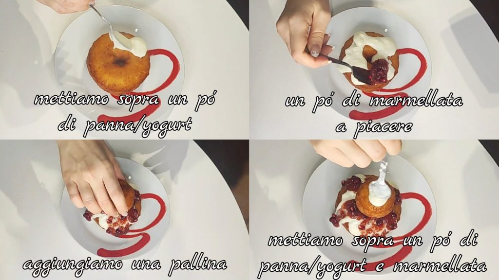 cobrimos com creme de leite e geleia, adicionamos uma bolinha e cobrimos também ela com um pouco de creme de leite e geleia.