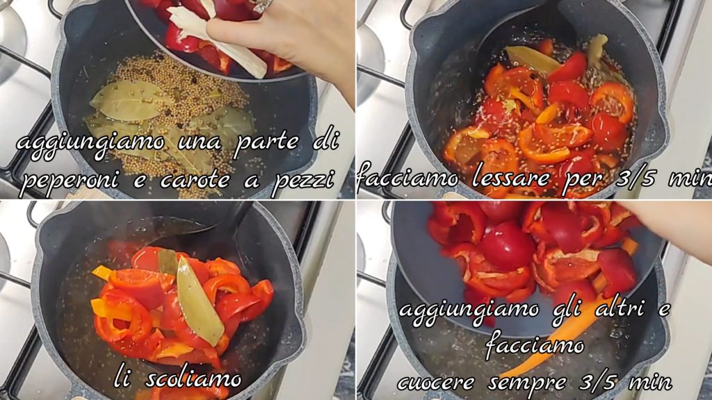 Adicionamos uma parte dos pimentões e cenouras limpas e cortadas em pedaços (cerca da metade) e deixamos cozinhar por cerca de 3/5 min. Escorremos e colocamos os pimentões e as cenouras restantes e deixamos cozinhar também por 3/5 min.