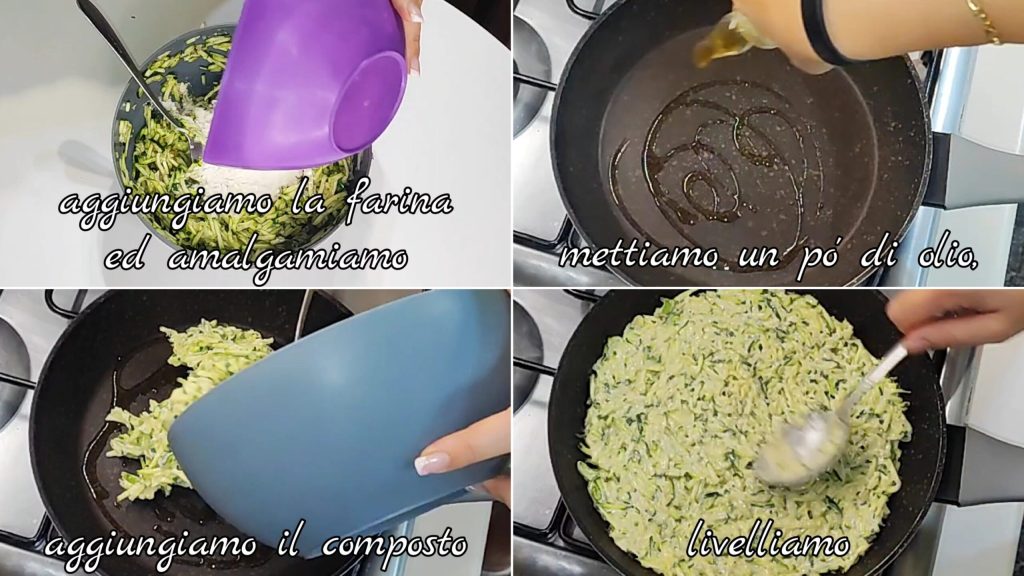 Adicionamos a farinha e misturamos bem. Em uma frigideira, colocamos um pouco de azeite e depois adicionamos a mistura obtida. Nivelamos com uma espátula.