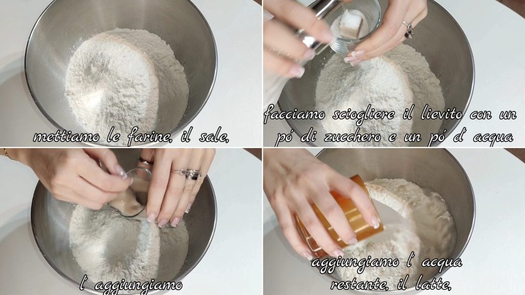 Colocamos as farinhas, um pouco de sal, dissolvemos o fermento com um pouco de açúcar e um pouco de água e adicionamos. Adicionamos a água restante e o leite.