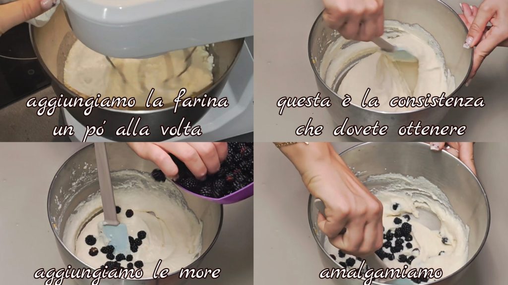 • Colocamos a farinha aos poucos, misturando (eu uso a batedeira em baixa velocidade enquanto adiciono a farinha). Adicionamos as amoras previamente lavadas e misturamos bem.