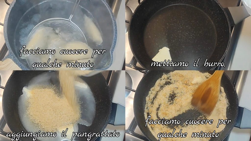 Em uma panela, derretemos a manteiga, adicionamos a farinha de rosca e deixamos cozinhar por alguns minutos.