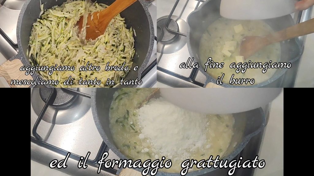 • Deixamos tostar por alguns minutos. Adicionamos o caldo de legumes aos poucos e deixamos cozinhar, mexendo de vez em quando. Na metade do cozimento, adicionamos as abobrinhas raladas.