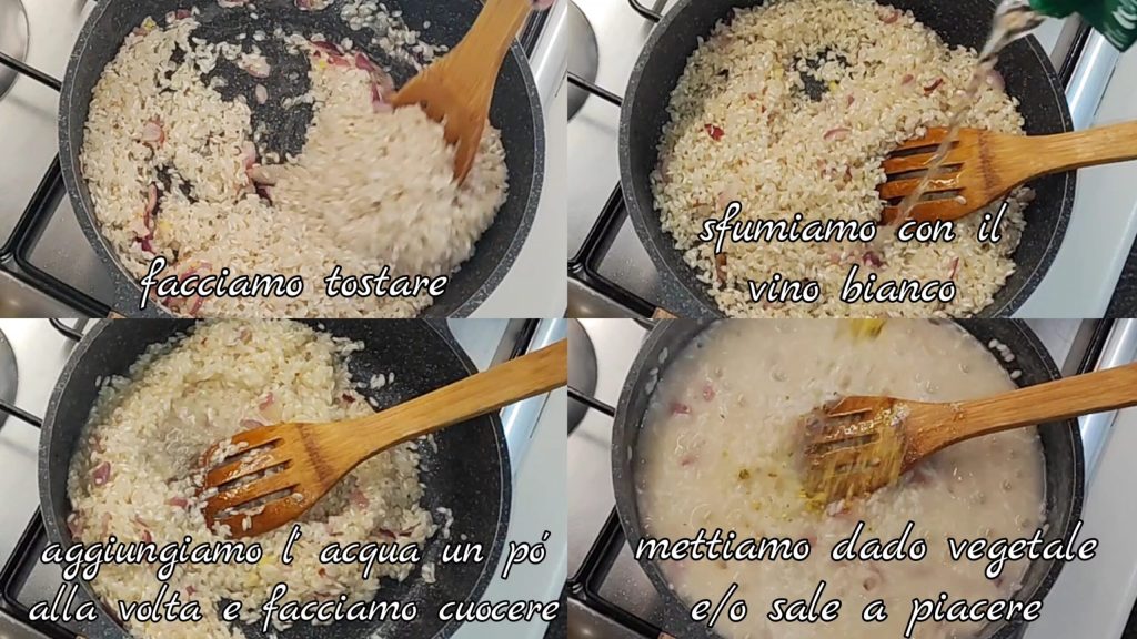 Deixamos tostar por alguns minutos. Despejamos o vinho branco e deixamos evaporar. Adicionamos a água aos poucos e cozinhamos mexendo de vez em quando. Colocamos o caldo de legumes e/ou sal a gosto.