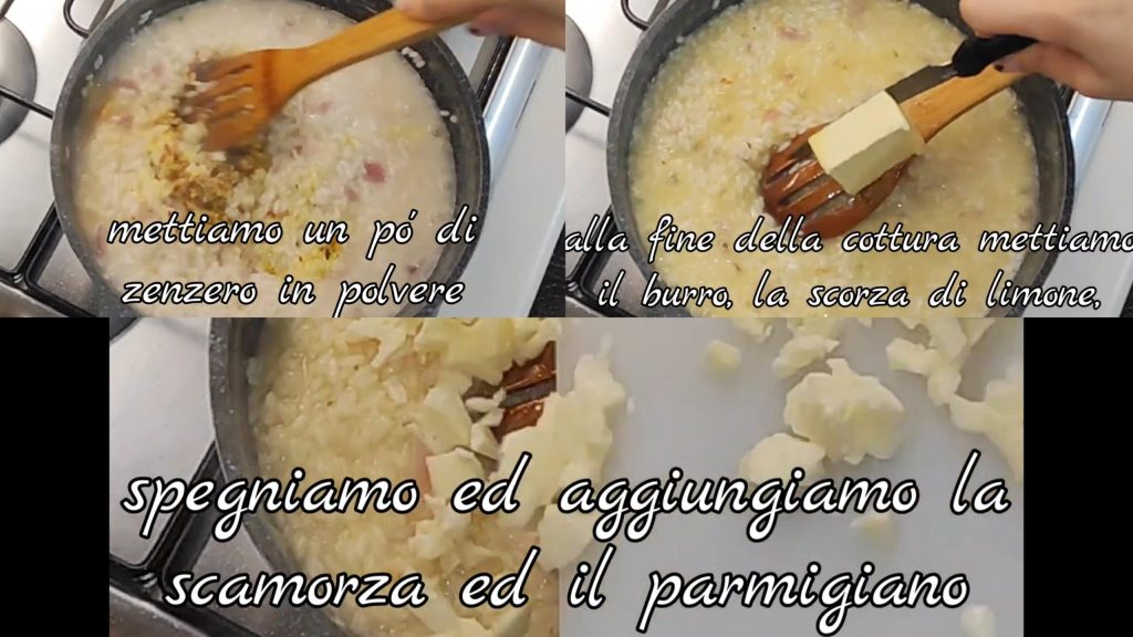 Adicionamos um pouco de gengibre em pó a gosto. No final do cozimento, colocamos a manteiga, a casca de limão e o suco. Desligamos e adicionamos o parmesão e a scamorza em pedaços.