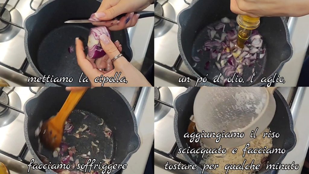 Em uma panela, coloque a cebola picada, um pouco de azeite, o alho e deixe refogar. Adicione o arroz previamente lavado e toste por alguns minutos.