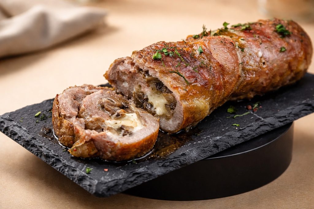 A carne de porco, macia e saborosa, é recheada com scamorza defumada, cogumelos e muçarela derretida, criando um recheio cremoso e irresistível. Durante o cozimento no forno, o rocambole fica dourado por fora e super suculento por dentro.