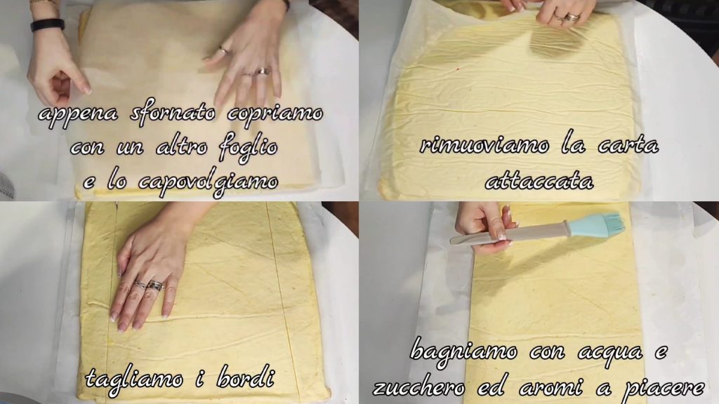 Assim que tirar do forno, colocamos um papel manteiga por cima e viramos. Retiramos o papel manteiga preso. Cortamos as bordas e umedecemos com água, açúcar e aromas à gosto.