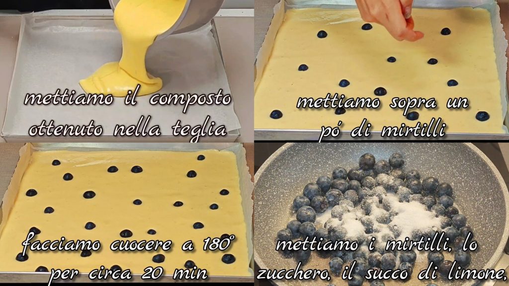 Coloque a massa em uma forma de 35×35 cm forrada com papel manteiga. Espalhe e nivele. Coloque alguns mirtilos por cima e asse a 180° por cerca de 20 minutos.