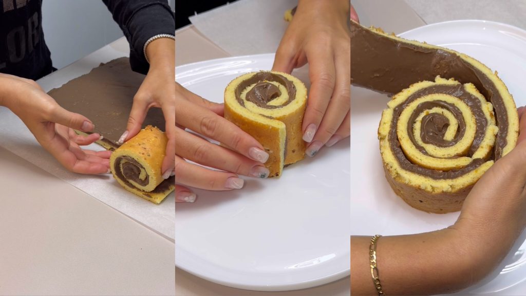 enrole a primeira tira sobre si mesma, coloque-a no centro do prato e depois coloque as outras tiras ao redor para criar o rocambole!