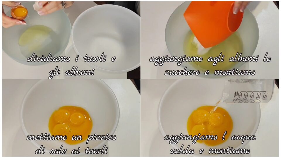 Primeiro, separe as gemas das claras. Adicione o açúcar às claras e bata com uma batedeira elétrica. Adicione uma pitada de sal às gemas, a água quente e bata também.
