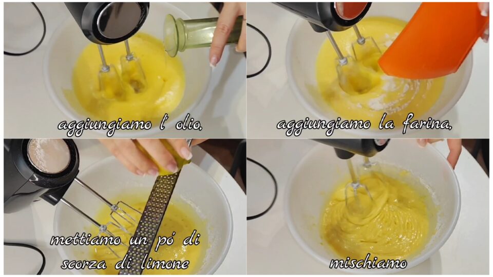Adicione o óleo, a farinha, um pouco de raspas de limão e misture.