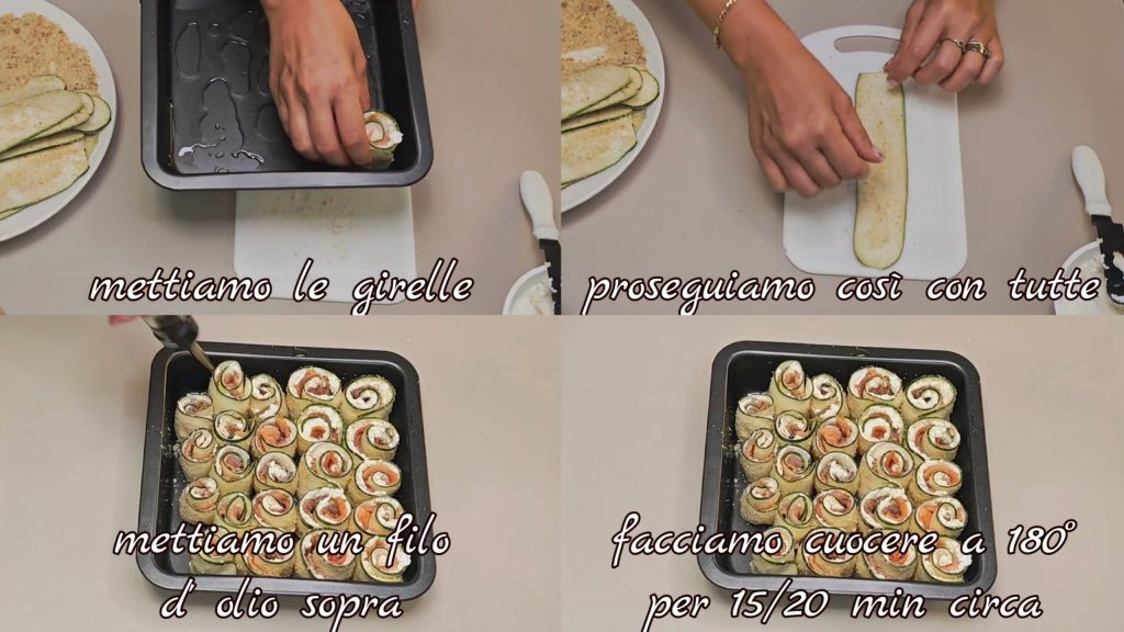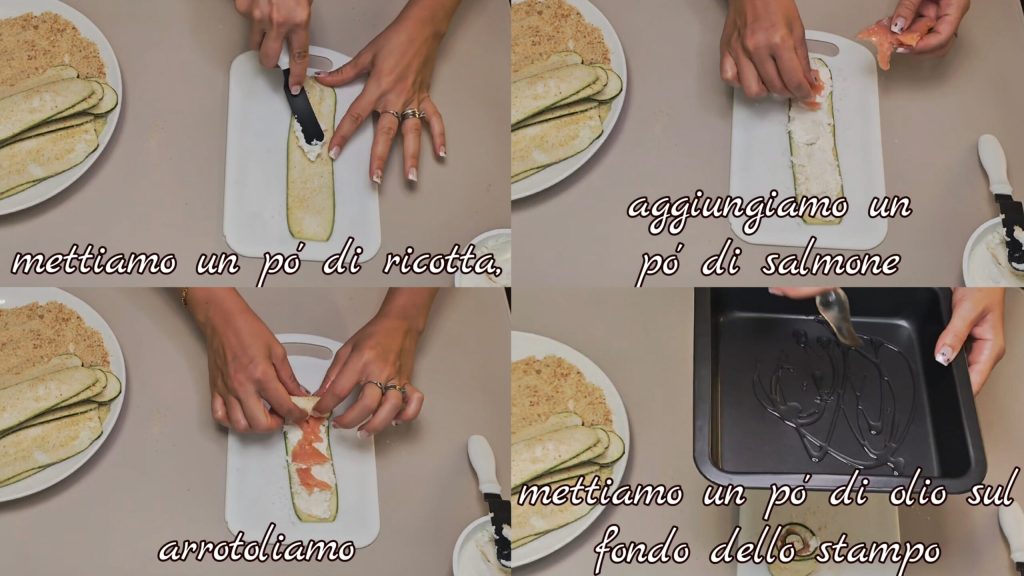 A preparação dos rolinhos de abobrinha com salmão e ricota é muito simples, veja o vídeo AQUI.