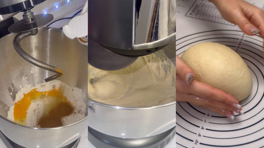 Em uma tigela, coloque a farinha, o fermento, o açúcar, a canela e o sal. Adicione o ovo, a manteiga e o leite, misturando até obter uma massa macia e elástica. Transfira para uma superfície de trabalho e forme uma bola.