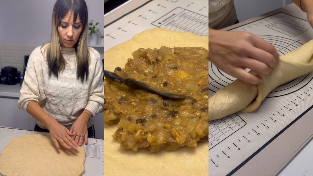 Distribua uniformemente o recheio de maçãs, nozes e passas.