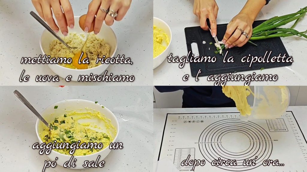Colocamos a ricota, os ovos e misturamos. Cortamos a cebolinha e adicionamos. Temperamos com sal.