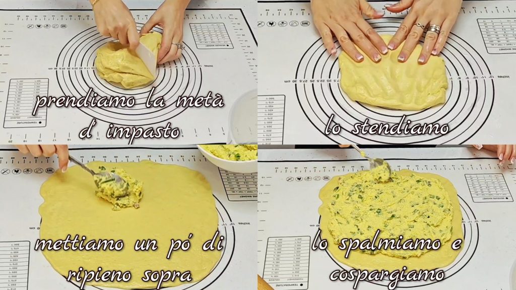 Após algumas horas, pegamos metade da massa e a estendemos. Colocamos um pouco de recheio por cima (cerca de metade), espalhamos e nivelamos.