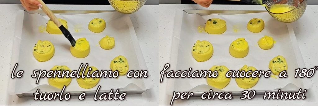 Pincelamos com uma gema e leite, depois assamos a 180° por cerca de 30 minutos.