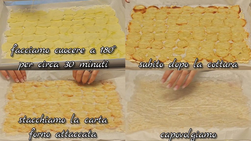 Primeiro, limpamos e cortamos as batatas em fatias bem finas (recomendo usar um ralador tipo mandolina). Espalhamos o parmesão na assadeira com papel manteiga dentro. Colocamos as fatias de batata em fila ligeiramente sobrepostas. Colocamos um pouco de sal e óleo por cima.