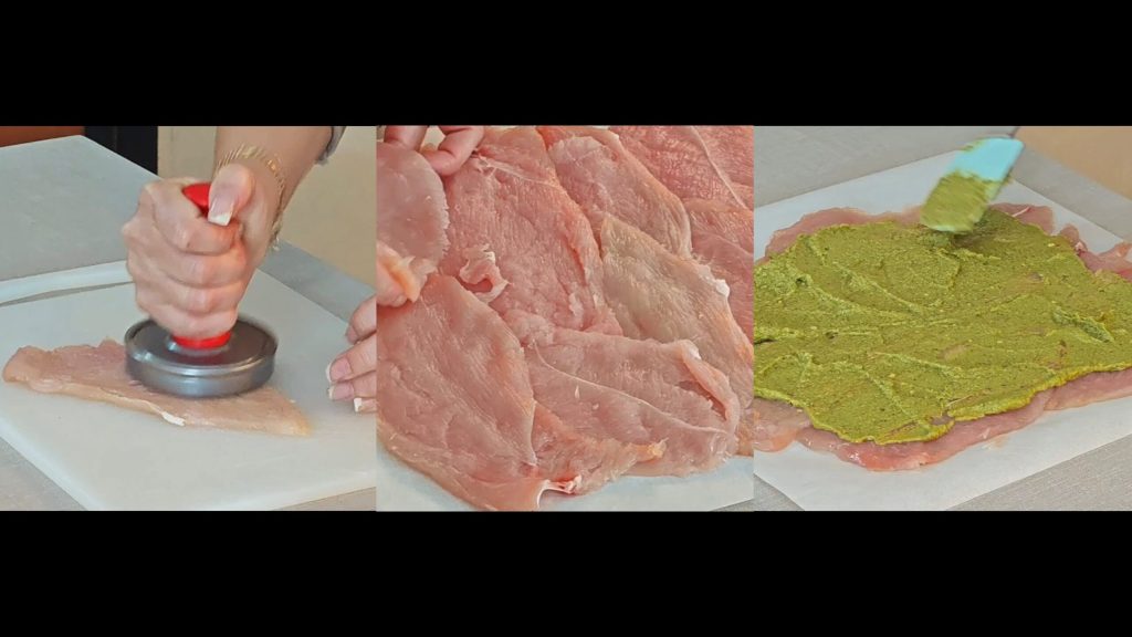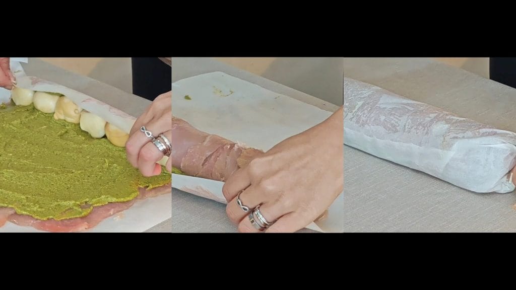 A preparação do rolo de frango com pesto e scamorza é muito simples, veja o vídeo AQUI.