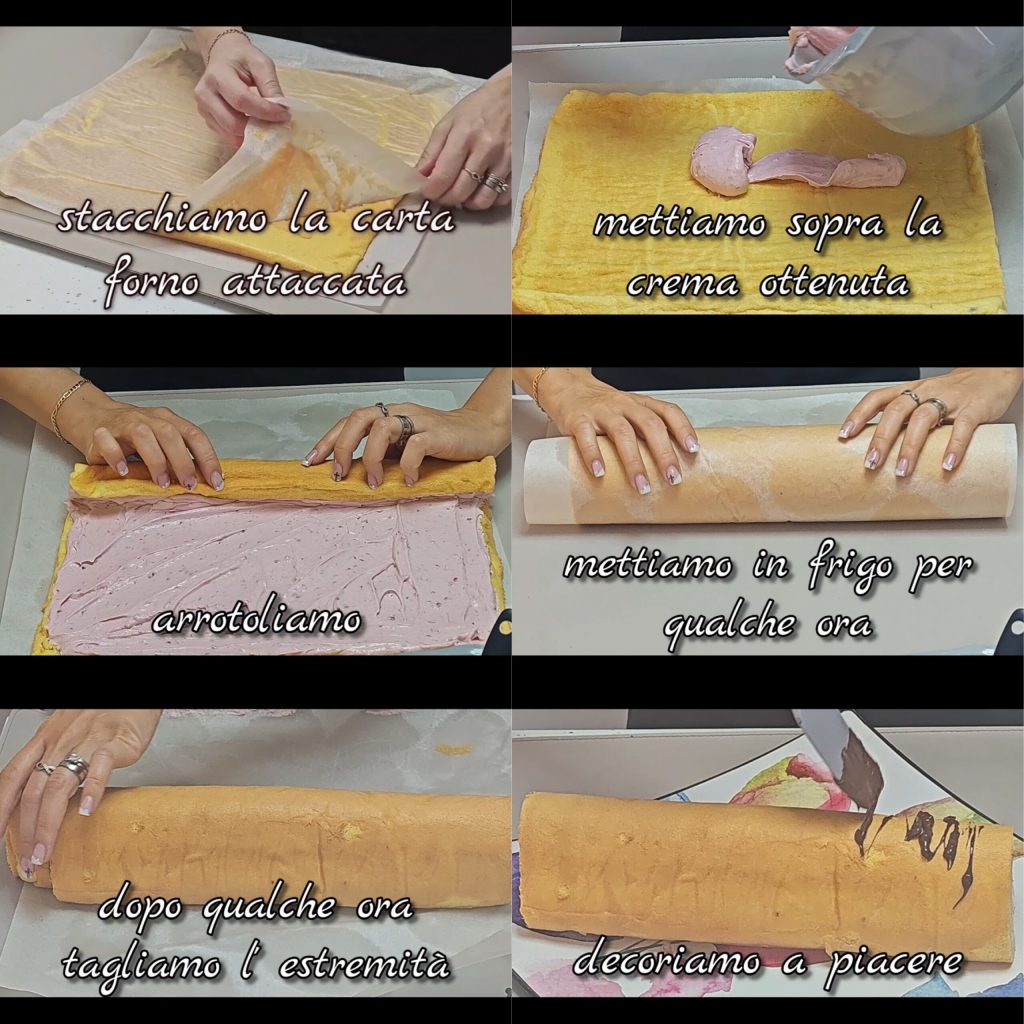 descolamos o papel manteiga que grudou durante o cozimento. Adicionamos o creme preparado, espalhamos e nivelamos, depois enrolamos e envolvemos em papel manteiga. Colocamos na geladeira por algumas horas, depois cortamos em fatias.