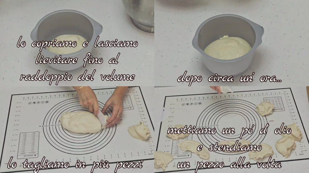 cobrimos e deixamos crescer até dobrar de volume. Após cerca de uma hora, cortamos em pedaços menores (do tamanho desejado) e estendemos um pedaço de cada vez, ajudando-nos com um pouco de óleo.
