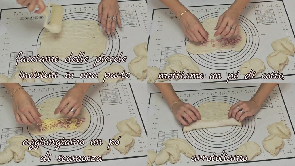 fechamos as pontas para formar uma rosquinha (assista ao vídeo). Continuamos da mesma forma com as outras. No final, se necessário, fazemos mais alguns pequenos cortes. Pincelamos com um pouco de leite