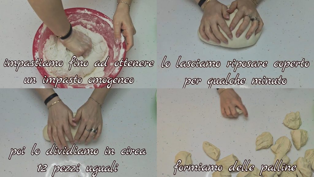 Amassamos até obter uma massa homogênea. Cobrimos e deixamos descansar por alguns minutos, em seguida dividimos em cerca de 12 partes iguais. Pegamos um pedaço de cada vez e formamos bolinhas.