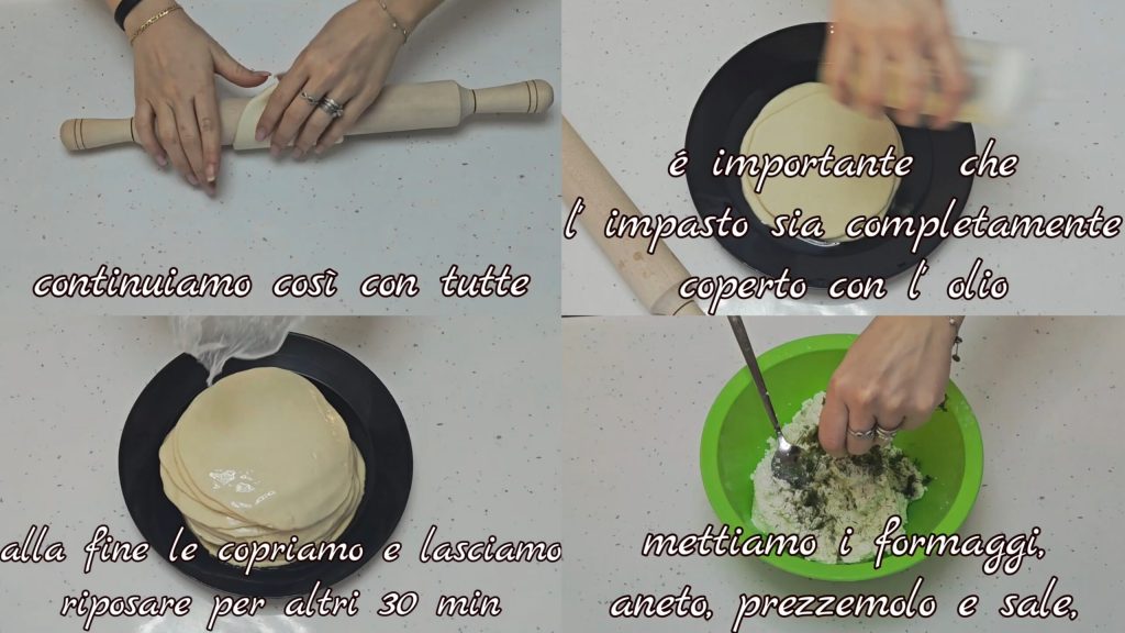 Cobrimos e deixamos descansar por cerca de 30 minutos. Passados cerca de 30 min, pegamos um pedaço de cada vez, abrimos e colocamos em um prato com um pouco de óleo dentro. Colocamos também um pouco de óleo por cima.