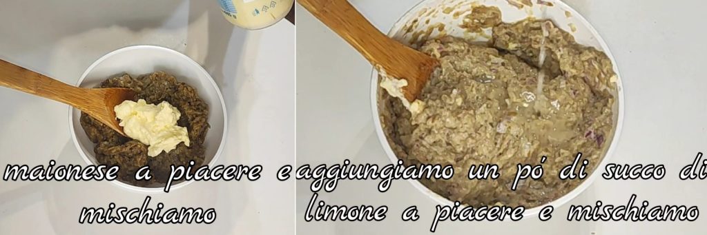 Adicionamos maionese a gosto e misturamos. Colocamos um pouco de suco de limão e misturamos tudo.