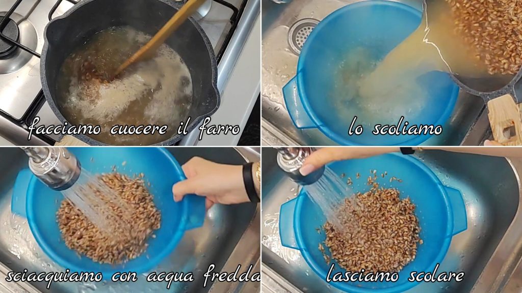 Primeiro, cozinhamos a espelta, escorremos, depois enxaguamos com água fria e deixamos escorrer.