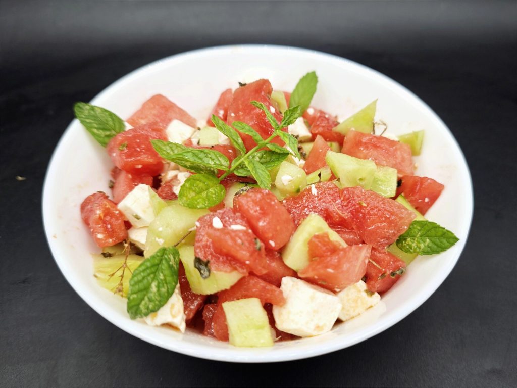 A preparação da salada de melancia com pepino e feta é muito simples e rápida, veja o vídeo AQUI.