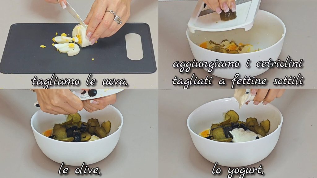 • Primeiro, cortamos os ovos cozidos. Adicionamos os picles cortados em fatias bem finas, as azeitonas e o iogurte.
