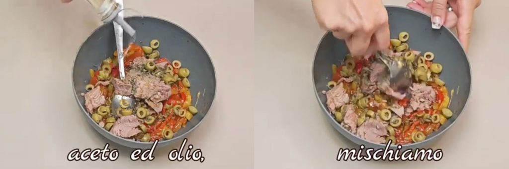 • removemos também as sementes e depois cortamos em tiras. Adicionamos o atum escorrido, as azeitonas, orégano, sal, alho,